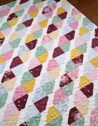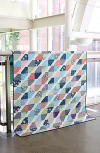 Twist Tie can be made with either Fat Quarters or yardage, and the pattern includes measurements, instructions, and diagrams for creating five sizes of quilts (baby, lap, throw, twin, and queen). See second photo for fabric requirements.